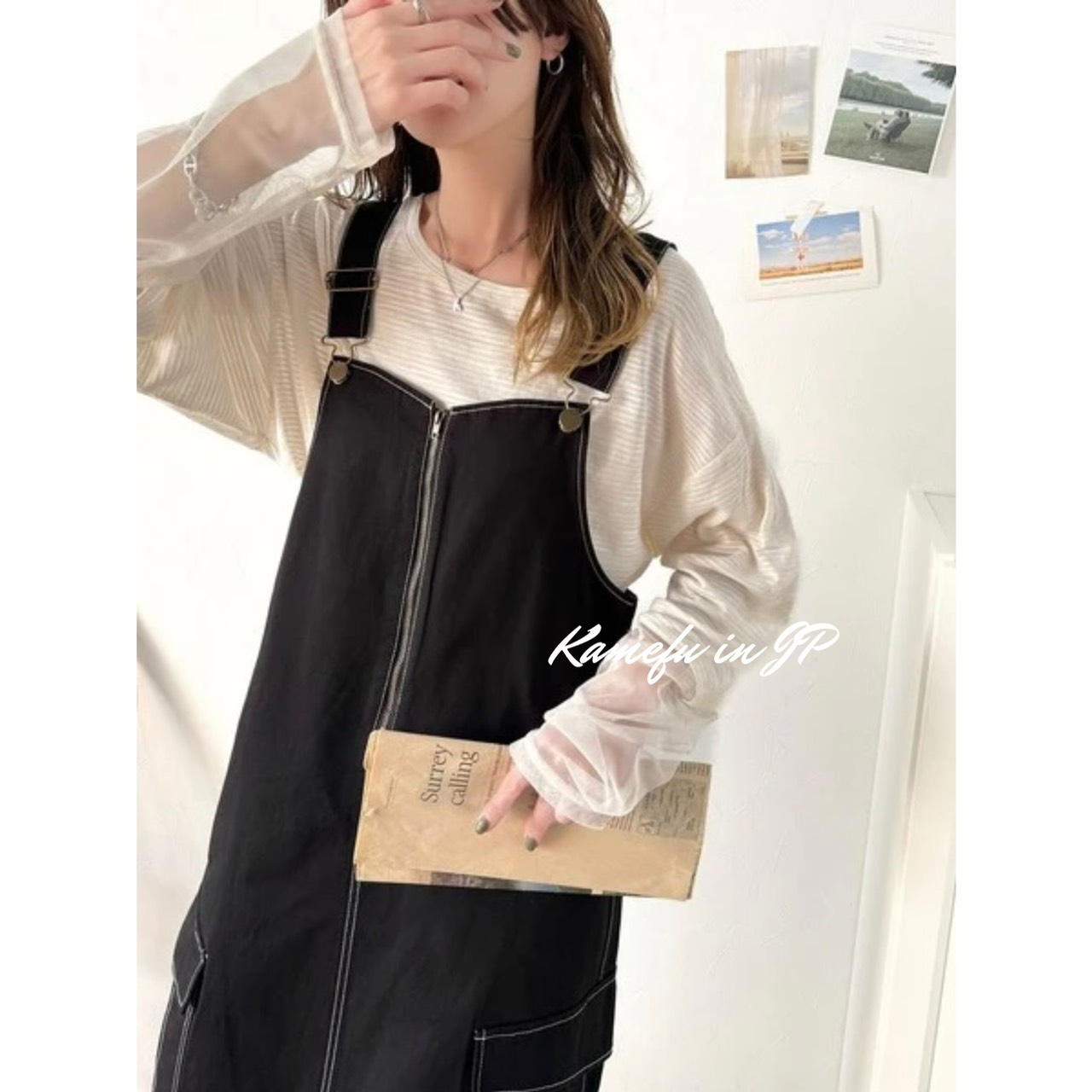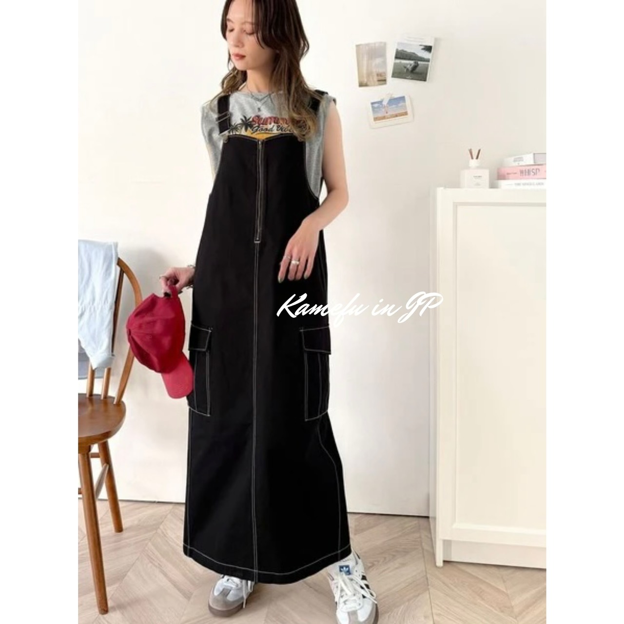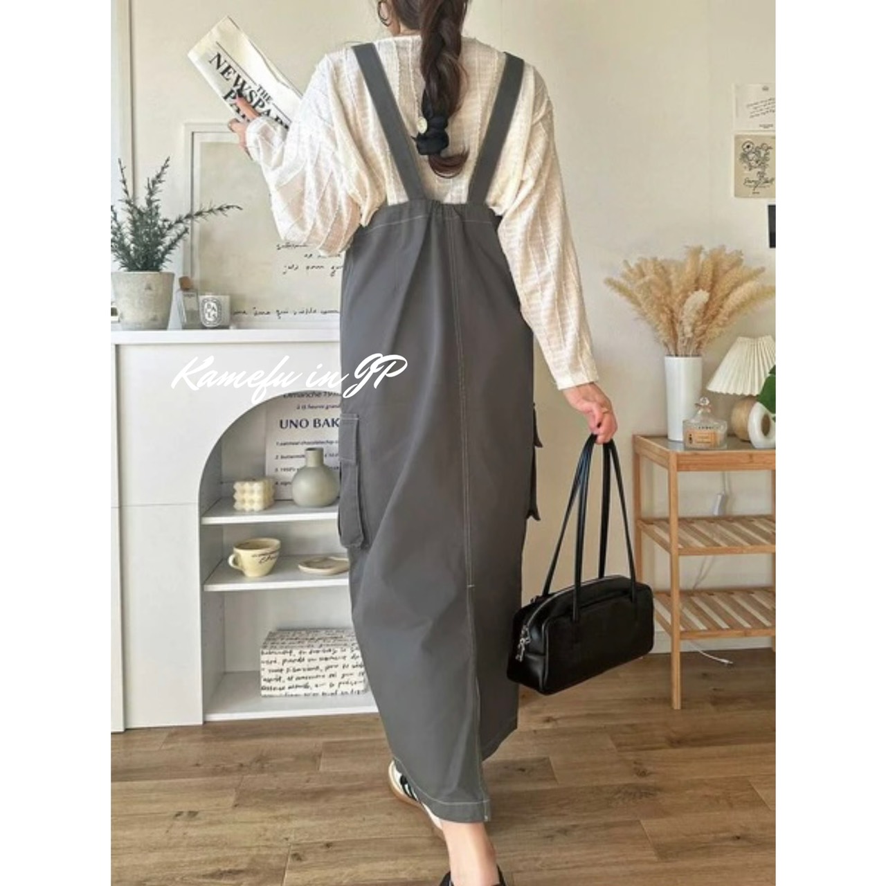 休閒縫線拉鍊純棉大口袋吊帶長裙